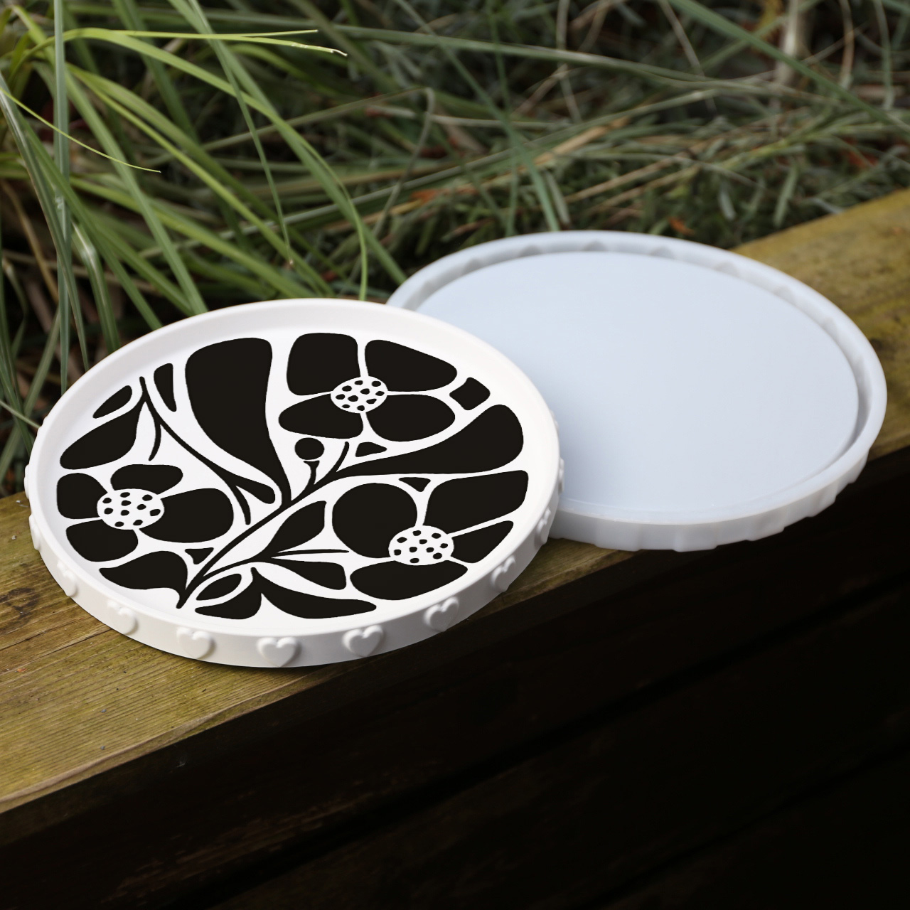 Toller Outdoorstoff mit Inlays für die Gießform – Dekoteller – Tablett – mit Sternen/Herzen. 🙂