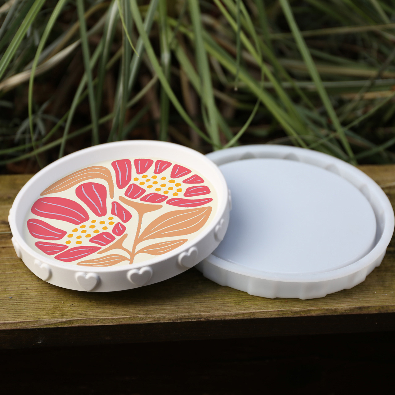 Toller Outdoorstoff mit Inlays für die Gießform – Dekoteller – Tablett – mit Sternen/Herzen. 🙂